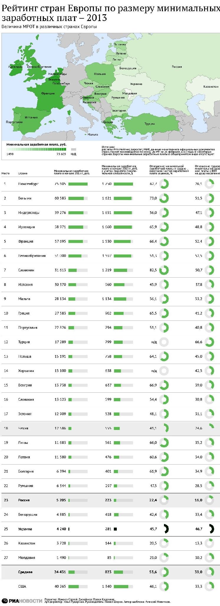 Заметим, что полученные результаты являются приблизительными, ведь при составлении рейтинга не учитывались страны, в которых в общепринятом виде отсутствует понятие минимальной заработной платы. К ним относятся, например, далеко не бедная Германия, Италия и страны Скандинавии.